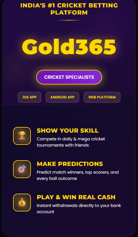 Gold 365 Cricket Betting India ka ek fast aur trusted online betting platform hai jahan aap IPL, T20 World Cup, ODI, Test matches aur live cricket betting kar sakte ho. Is platform par high odds, fast withdrawal aur secure gameplay milta hai jo users ko best betting experience deta hai.